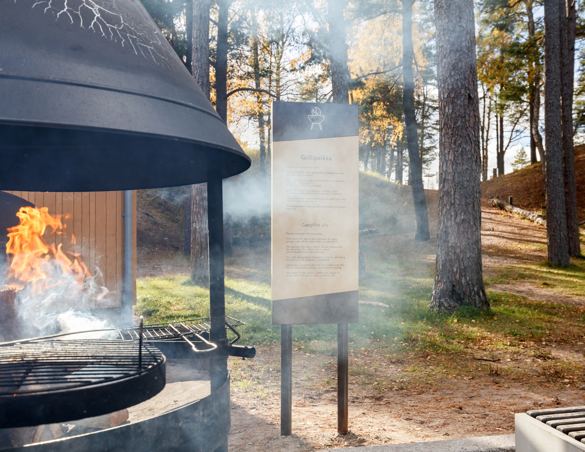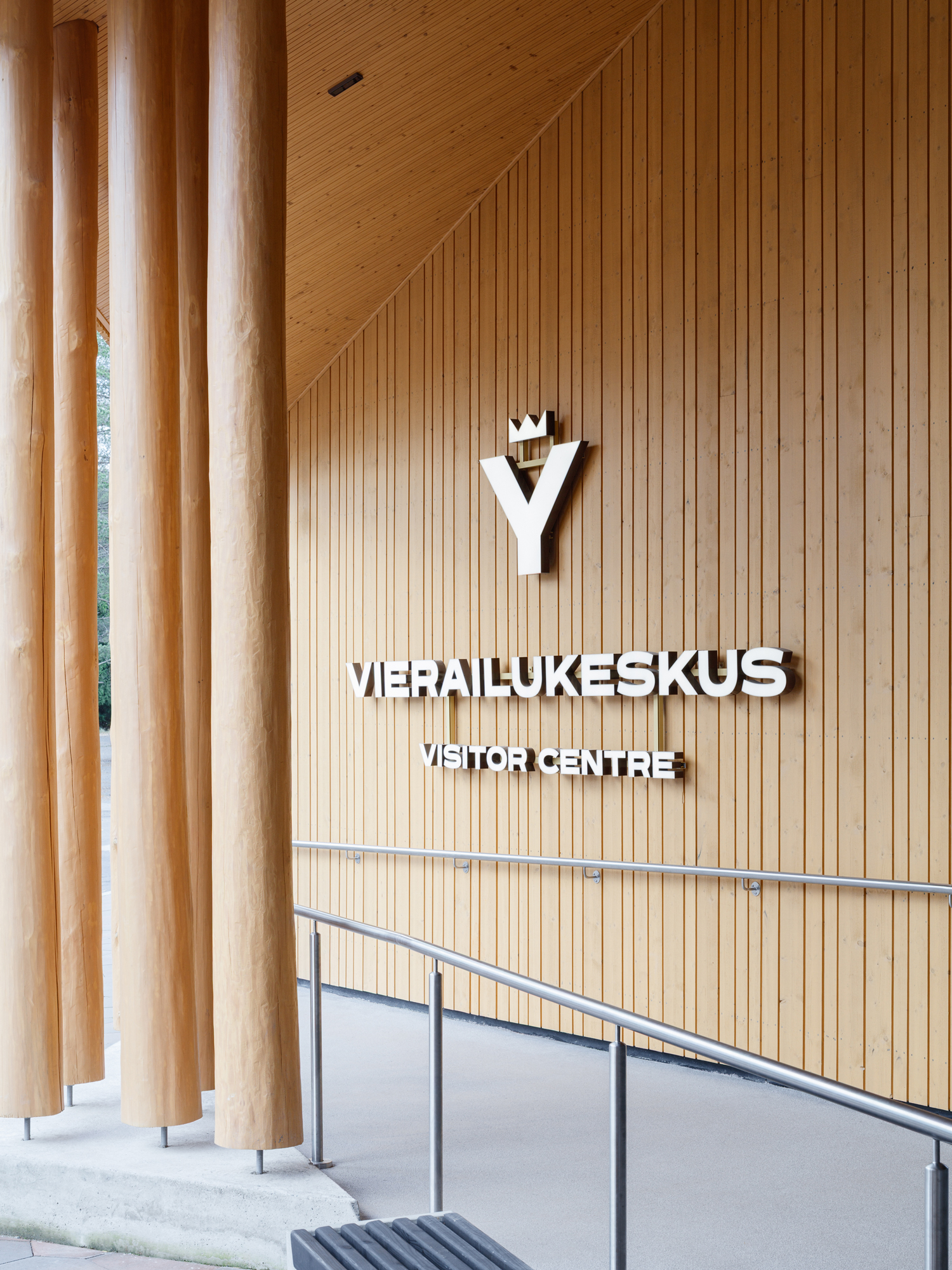 Dyynien muodoista inspiroituneet opasteet jatkavat alueen arkkitehtuurin yhtenäistä ilmettä