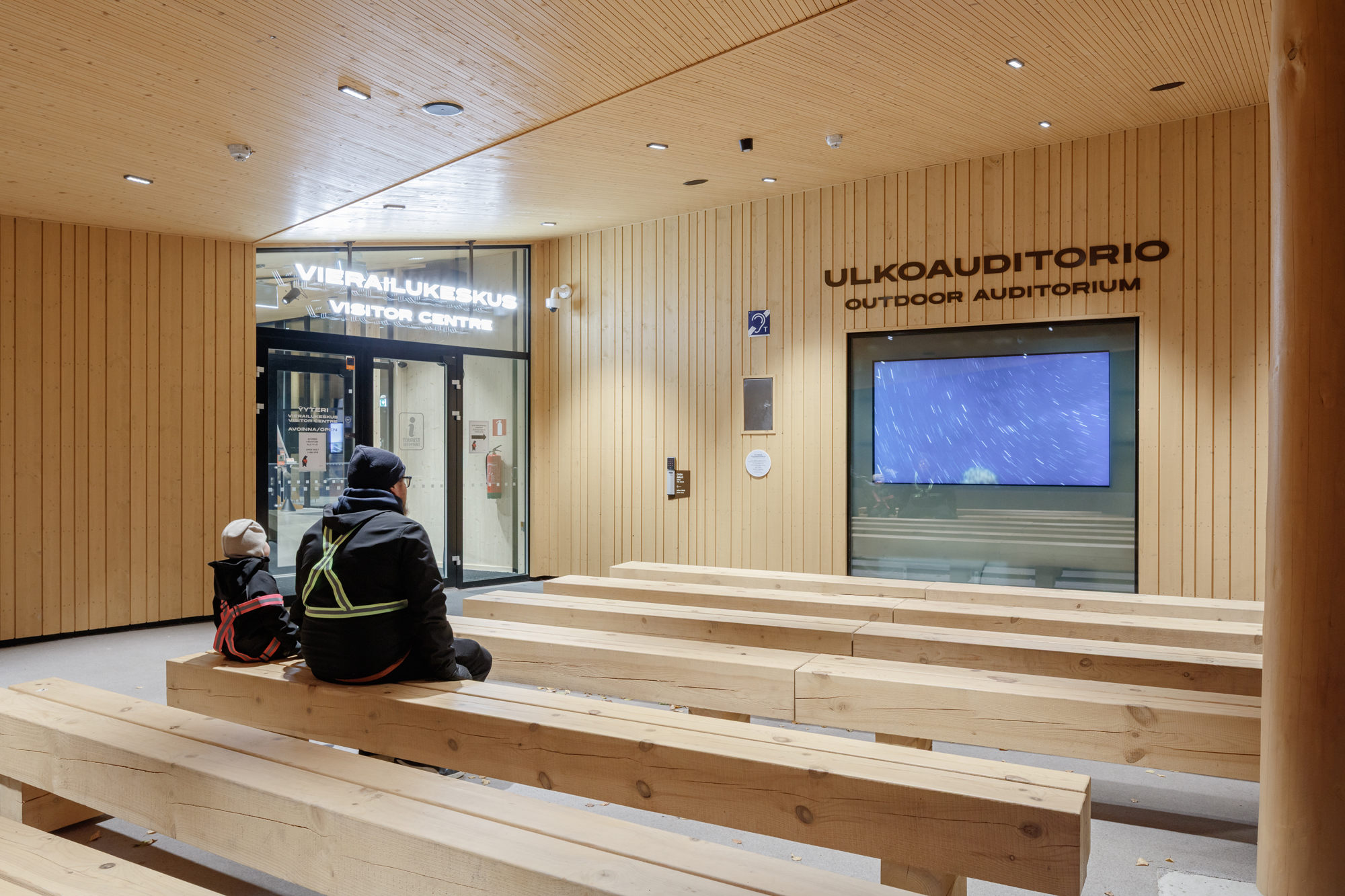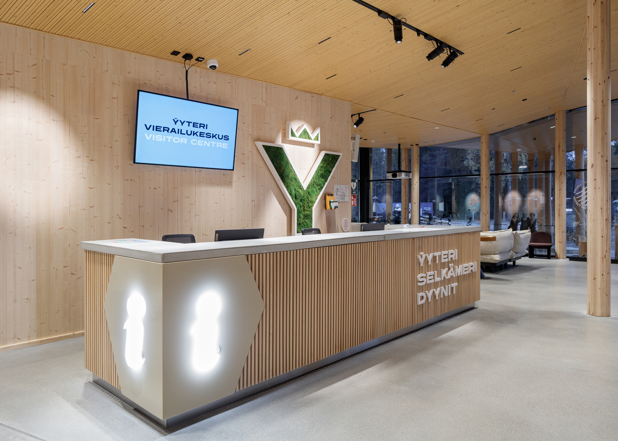 Myös toimintoja on useita, sekä sisä- että ulkotiloissa. Palveluiden saavutettavuus ja löydettävyys nousivat projektin keskeiseksi tarpeeksi – opastuksen avulla haluttiin helpottaa liikkumista ja parantaa käyttäjäkokemusta niin rakennuksen sisällä kuin sen ympäristössä.